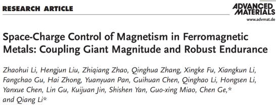 新聞網(wǎng)訊 磁電耦合調(diào)控是發(fā)展低功耗、非易失、快速度、多功能自旋電子器件的關(guān)鍵,蘊(yùn)含著豐富的物理內(nèi)涵和巨大的應(yīng)用前景。近日,我校物理科學(xué)學(xué)院教授李強(qiáng)課題組提出了一種全新的調(diào)控策略——空間電荷磁電耦合機(jī)制,為載流子相關(guān)的物性調(diào)控研究提供了一種新思路。相關(guān)研究成果以“Space-charge control of magnetism in ferromagnetic metals: coupling giant magnitude and robust endurance”為題,刊發(fā)在材料領(lǐng)域著名期刊Advanced Materials上。論文第一作者是物理科學(xué)學(xué)院2019屆研究生李召輝(加拿大滑鐵盧大學(xué)攻讀博士學(xué)位)與2020屆研究生劉恒均,物理科學(xué)學(xué)院李強(qiáng)教授與中科院物理所葛琛研究員為論文通訊作者,青島大學(xué)為第一通訊單位。