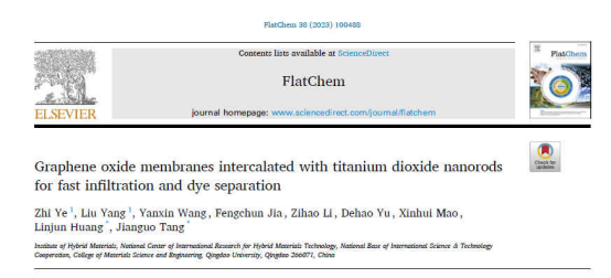 新聞網訊 近日,我校材料科學與工程學院2020級高分子材料與工程創新班本科生葉芷在石墨烯基雜化納濾膜研究領域取得新進展,研究成果以“Graphene oxide membranes intercalated with titanium dioxide nanorods for fast infiltration and dye separation”為題發表在國際期刊《FlatChem》上(DOI: 10.1016/j.flatc.2023.100488),該期刊為SCI收錄期刊(2022年影響因子5.829),是Elsevier旗下第一份專注于石墨烯及相關二維和分層材料最前沿研究的期刊。葉芷是論文第一作者,指導教師和論文通訊作者為黃林軍教授和唐建國教授,青島大學為第一單位和通訊單位。