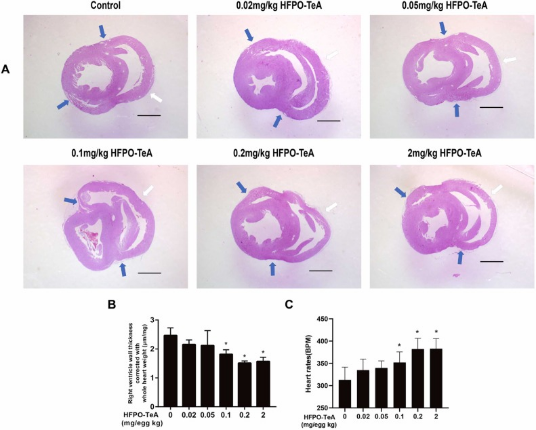由公共衛生學院本科生、研究生共同組成的研究團隊對HFPO-TeA潛在的發育毒性與機制進行了研究,發現HFPO-TeA發育暴露后,雞胚出現發育心臟毒性和發育肝臟毒性,具體表現為右心室壁變薄、心率加快和肝脂肪變性。通過慢病毒胚胎微注射注射實現PPARα在體沉默后,觀察到上述毒性的緩解。Western blotting結果表明,HFPO-TeA的發育暴露顯著增加了雛雞心臟和肝臟組織樣品中PPARα下游分子EHHADH和FABPs的表達水平,而PPARα沉默有效地阻止了這種變化,這表明PPARα及其下游基因在HFPO-TeA誘導的發育毒性中發揮著重要作用。