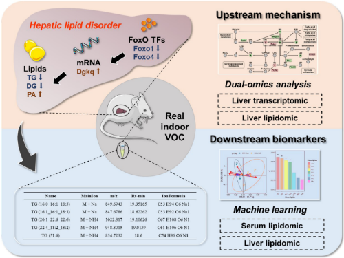 人類約90%的時間都處在室內環境中,室內環境停留的時間約為室外活動的5倍,室內空氣污染的健康危害一直是環境健康領域的重要議題。揮發性有機化合物(VOC)作為廣泛存在于室內空氣中的污染物,對人體健康影響不容忽視。晉小婷教授團隊采用真實室內環境VOC暴露的動物染毒平臺,結合機器學習和多組學聯用分析技術,發現真實室內VOC能導致肝臟脂質代謝出現異常,尤其是三酰甘油(TG)及其前體物質二酰甘油(DG)的減少,這可能是引起肝臟不良反應的關鍵因素之一。此外,通過機器學習技術,研究團隊還發現了血清中的五種脂質生物標志物,這些標志物能夠反映VOC誘導的肝臟脂質紊亂情況。多組學方法的應用進一步揭示了上調的Dgkq基因對DG和磷脂酸(PA)之間相互轉化的干擾,導致TG水平下降。VOC能夠下調FoxO轉錄因子,這有助于Dgkq的上調。這一發現從多組學分析的角度,為更好地理解真實室內VOC暴露引起的肝臟損傷提供了重要依據。
