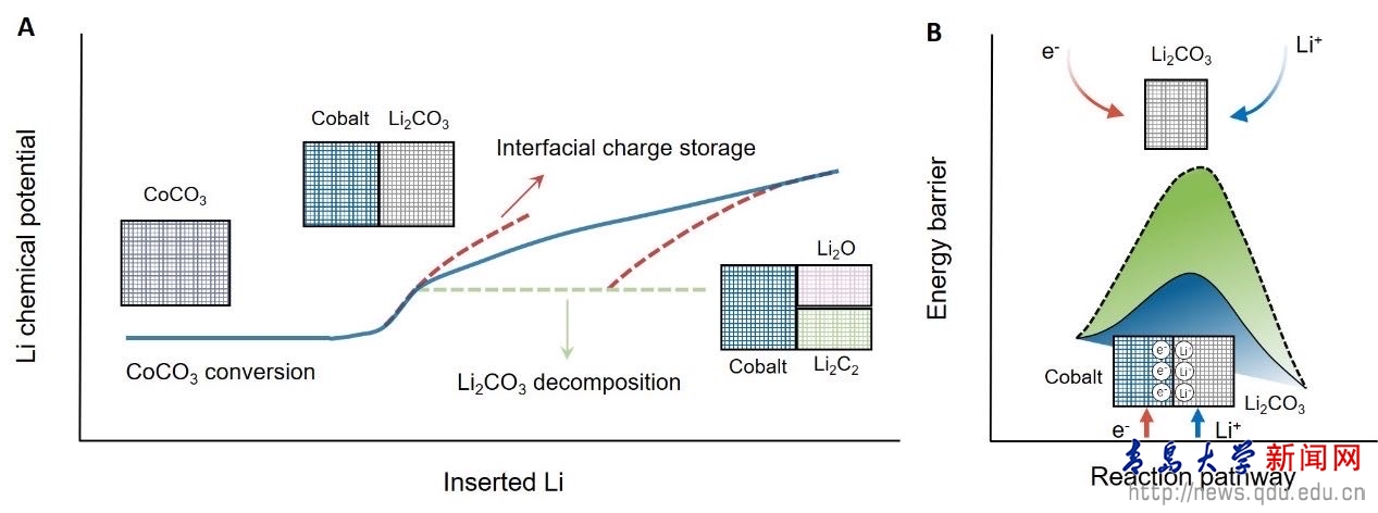 過渡金屬和相關化合物由于其有趣的電子結構而在各種電化學反應中表現出高催化活性。鮮為人知的是,它們在電池電極中存儲和轉移電子方面的獨特作用,電池電極經歷額外的固態轉化反應,并表現出相當大的額外容量。在這項工作中,研究人員在CoCO3/Li電池模型中揭示了在金屬納米顆粒存在下電化學界面的產生和演變的完整動態圖像。除了在電池放電過程中傳統地還原為Li2CO3/Co混合物之外,Li2CO3的進一步分解是通過從其相鄰的Co納米顆粒釋放界面間存儲的電子來實現的。這項工作的發現不僅可以啟發下一代儲能器件先進電極材料的發展,而且為揭示許多能量轉換和存儲系統中重要電催化機制提供了解決方案。