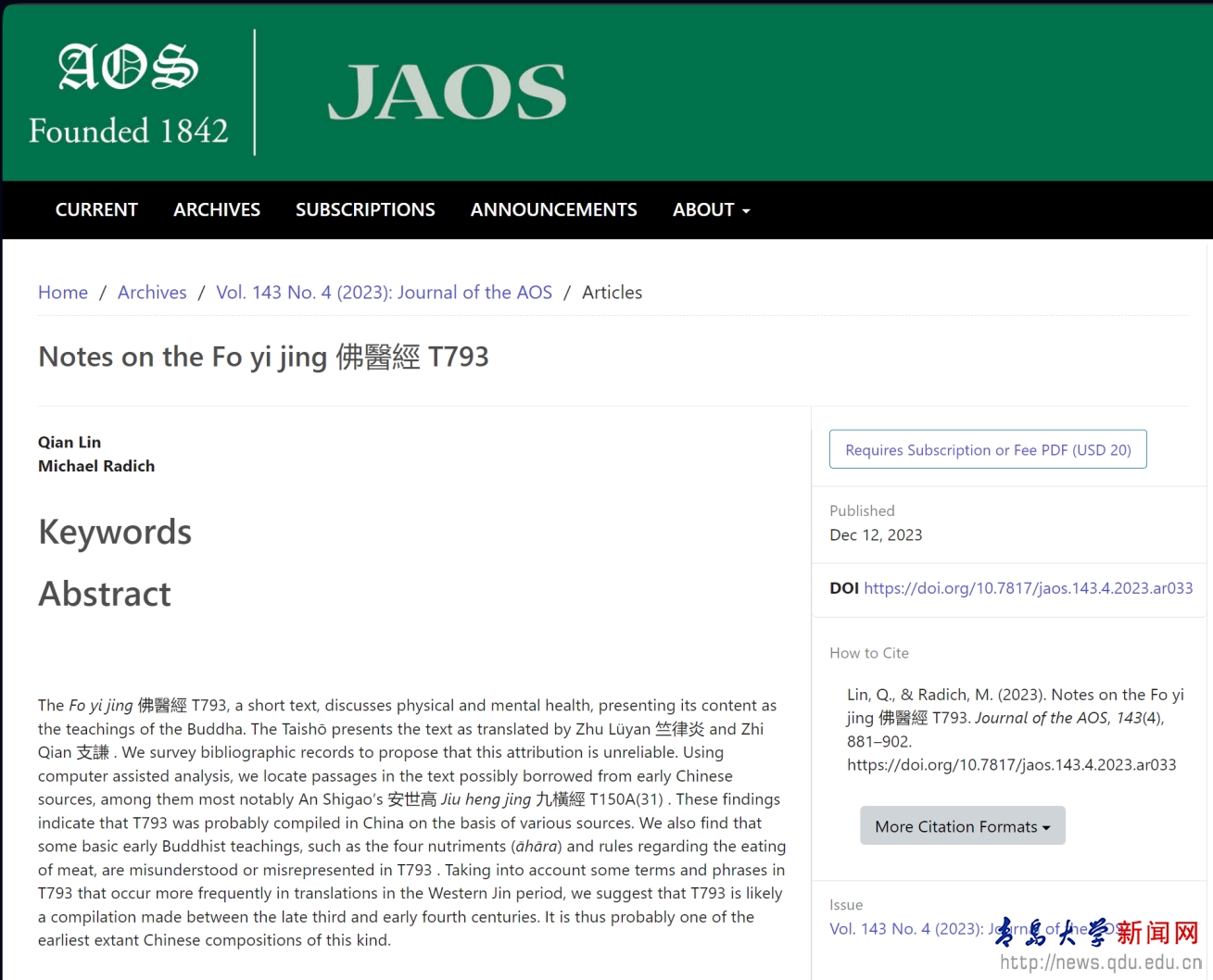 新聞網(wǎng)訊 近日,歷史學院林倩副教授和德國海德堡大學何書群(MichaelRadich)教授的合作研究成果在美國東方學會會刊Journal of theAmericanOrientalSociety上發(fā)表,題為“Notes on the Fo yi jing佛醫(yī)經(jīng)T793”。Journal of theAmericanOrientalSociety是北美歷史最悠久的亞洲學術研究期刊,是世界上最負盛名亞洲及中國研究的期刊之一,收錄于藝術與人文引文索引(A&HCI)。林倩副教授是論文的第一作者,青島大學為論文的第一署名單位。