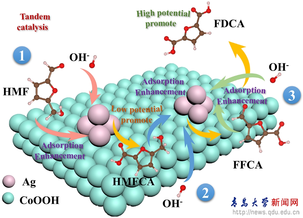 針對上述問題,周鵬等人通過構建Ag-Co(OH)2串聯異質催化劑,實現了不同電位范圍內HMFCA和FDCA的高效選擇性合成。通過對機理的研究發現Ag-Co(OH)2串聯催化劑的構建能夠提高有機分子和OH-物種的吸附轉化效果,促進低電位區間醛基氧化,并通過串聯協同催化作用降低高電位區間HMFCA→FFCA步驟的轉化能壘,從而加快反應過程。該工作實現了一種串聯催化劑對兩種高附加值化學品的選擇性合成,為高效多組分催化劑的設計和開發提供了有力的參考和指導。