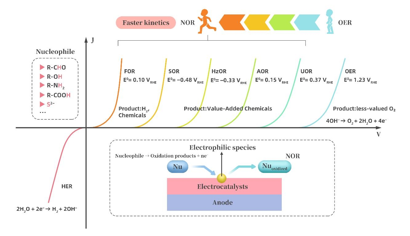 得益于高能量密度、零碳排放和可再生性等優勢,氫被認為是化石燃料的理想替代品,預計氫氣將緩解能源危機,實現全球碳中和。目前,電催化全水分解是一種清潔、高效的制備高純氫的方法。電催化全水分解反應涉及兩個半反應:陰極析氫反應(HER)和陽極析氧反應(OER)。然而,陽極析氧反應動力學緩慢,需要高電解電位和貴金屬催化劑來克服反應能壘,導致能量消耗過多(>4.5-6 kWh m-3 H2)。此外,陽極析氧反應產生低價值的O2,它不僅干擾H2,并有爆炸的危險,構成安全隱患。盡管對高效催化劑進行了廣泛的理論研究和實際開發,目前全世界H2總量中只有4%來自全水分解。因此,在電解水制氫體系中,引起了生物質氧化反應(如醛、醇、胺、尿素、肼等)代替陽極析氧反應的研究熱潮。然而,對于這些氧化反應并沒有統一的定義。本質上,具有活性氫的親核基團(如醛基、羥基、氨基和羧基)或帶有未共享電子對的負離子是這些生物質氧化反應過程中的反應位點。因此,親核試劑氧化反應(NOR)可充分描述這些生物質電氧化過程。親核試劑氧化反應NOR作為陽極析氧反應OER的替代品具有巨大的潛力。NOR提供更快的動力學,產生高附加值產品,并減少能源消耗。通過NOR與陰極析氫反應HER耦合,可以提高產氫效率,同時產生有價值的副產物或降解污染物。本論文重點探究了陽極氧化反應中不同NOR的反應機理和反應路徑,旨在為今后NOR偶聯HER制氫的研究提供理論指導。此外,NOR耦合制氫電解槽的設計對于產業化發展具有重要意義,其中無膜電解槽在大電流和耐久性方面更具優勢,近幾年取得了巨大進展。但是,NOR耦合制氫技術仍處于研發階段,距離產業化還有很長的路要走。