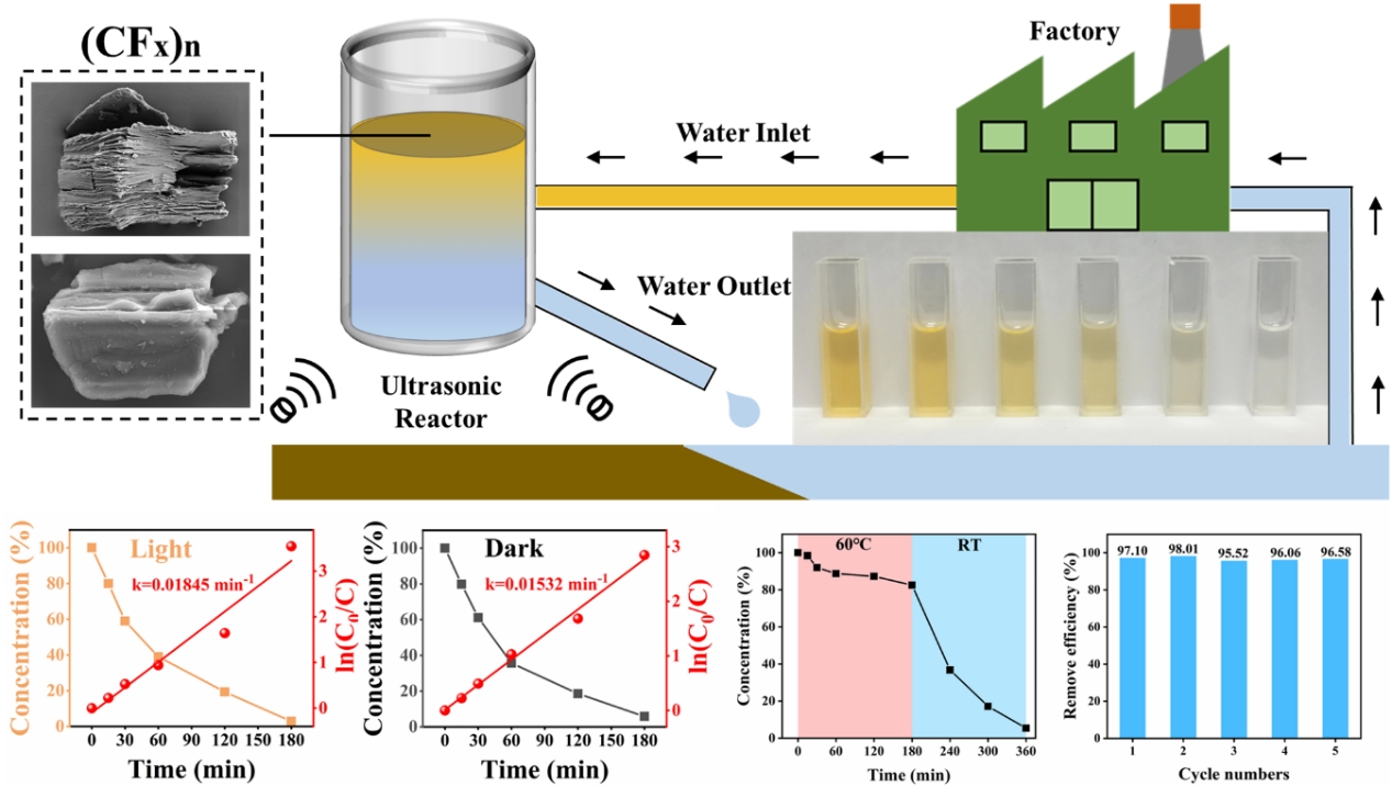 最近幾年,接觸電催化(CEC)作為一種有效的降解有機(jī)污染物的方法已經(jīng)引起了人們的極大興趣。然而,目前用于接觸電催化的催化劑材料選擇是有限的,且它們的有效性通常受到環(huán)境影響而導(dǎo)致催化性能下降。本工作提出了一種新型氟化石墨[(CFx)n]催化劑,拓寬了接觸電催化劑材料的可用范圍。研究表明二維氟化石墨催化劑即使在無(wú)光條件下仍保持較高的催化活性,且在高溫條件下表現(xiàn)出良好的穩(wěn)定性,大大優(yōu)于傳統(tǒng)的有機(jī)聚合物接觸電催化劑(例如氟化乙烯丙烯共聚物FEP、聚四氟乙烯PTFE和聚偏氟乙烯PVDF)。此外,密度泛函理論DFT計(jì)算揭示了影響催化性能的關(guān)鍵因素。論文深入分析了溫度對(duì)接觸電催化效率的影響機(jī)制。經(jīng)過(guò)多次接觸電催化循環(huán)實(shí)驗(yàn)驗(yàn)證,氟化石墨粉末催化效率保持在95%以上,且可降解多種水中有機(jī)污染物(例如甲基橙、羅丹明B和結(jié)晶紫),展示出其在大規(guī)模有機(jī)污染物處理系統(tǒng)中的潛力。這些結(jié)果對(duì)于推動(dòng)接觸電催化技術(shù)在環(huán)境治理領(lǐng)域的應(yīng)用具有重要意義,并為設(shè)計(jì)更高效、穩(wěn)定的催化劑提供了有益參考。