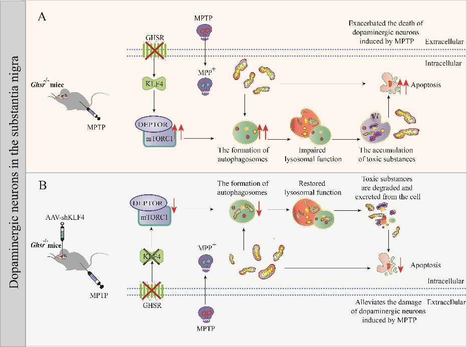帕金森病是多發于中老年人的神經系統退行性疾病。該課題組前期研究發現,外源性給予ghrelin可通過激活生長激素促分泌素受體(GHSR)在帕金森病中發揮神經保護作用。課題組在該研究中觀察到GHSR敲除后能夠加劇MPTP誘導的帕金森病小鼠模型黑質多巴胺能神經元損傷,具體機制表現為GHSR敲除可增加KLF4的表達,進而轉錄調節mTORC1的DEPTOR亞基,導致自噬的持續激活和溶酶體功能障礙,從而抑制受損線粒體的清除。同時,敲低KLF4后可有效逆轉上述過程,抑制黑質多巴胺能神經元損傷。該研究闡明了內源性GHSR在維持多巴胺能神經元功能中的重要作用,為帕金森病的治療提供了新的靶點和實驗依據。