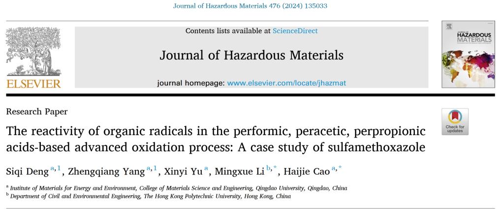 新聞網(wǎng)訊 近期,材料科學(xué)與工程學(xué)院高分子材料與工程專業(yè)2022級本科生鄧思琪以第一作者在SCI一區(qū)期刊Journal of Hazardous Materials(IF=12.2)上發(fā)表一篇題為《The reactivity of organic radicals in the performic, peracetic, perpropionic acids-based advanced oxidation process: A case study of sulfamethoxazole》的研究論文,該工作在能源與環(huán)境材料研究院開展,曹海杰副教授為指導(dǎo)教師和通訊作者。