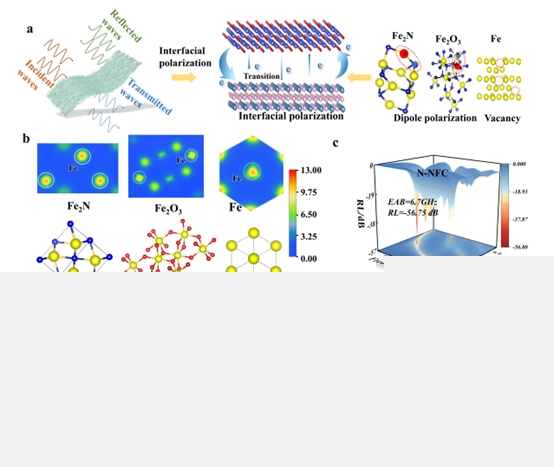 雜原子摻雜與非均質界面調控已被證實是提升電磁波吸收性能的有效策略,如何精準設計原子級摻雜結構并揭示多界面協同機制仍是該領域的難點。團隊設計并構建一種雜原子優化協同極化策略,通過氣氛誘導熱解法對Fe基MOF前驅體進行精準調控,成功制備了雜原子摻雜的碳納米纖維復合材料。雜原子誘導的協同極化效應,包括偶極子極化、界面極化和缺陷誘導極化,共同增強材料的整體吸收能力。