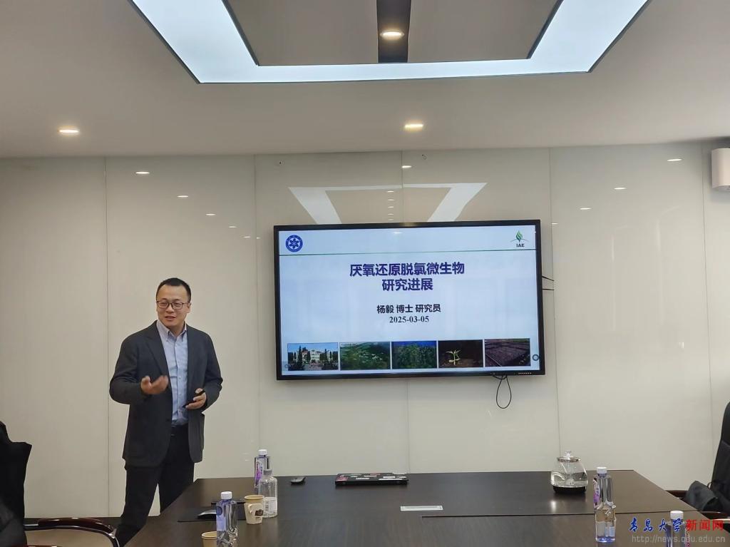 楊毅研究員為學(xué)院師生作了題為“厭氧還原脫氯微生物研究進(jìn)展”的學(xué)術(shù)報(bào)告。報(bào)告中,楊毅研究員分享了脫氯菌群富集培養(yǎng)成果,揭示了微生物在低pH環(huán)境下的脫氯機(jī)制,為解決實(shí)際場(chǎng)地修復(fù)問題提供了理論指導(dǎo);在新污染物治理方面,楊毅研究員介紹了六氯- 1,3-丁二烯(HCBD)的來源、危害及在環(huán)境中的遷移轉(zhuǎn)化規(guī)律,分析了脫鹵擬球菌在HCBD降解中的關(guān)鍵作用。報(bào)告會(huì)后,楊毅研究員與師生們進(jìn)行了互動(dòng)交流,耐心解答了相關(guān)問題,現(xiàn)場(chǎng)學(xué)術(shù)氛圍熱烈活躍。