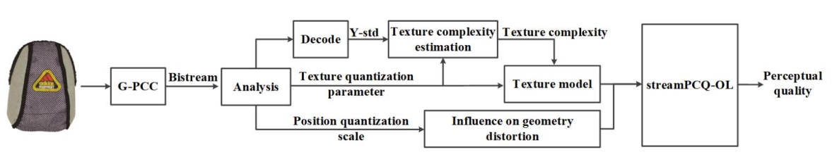 《No-Reference Bitstream-Based Perceptual Quality Assessment of Octree-Lifting Encoded 3D Point Clouds》發(fā)表于IEEE Transactions on Visualization and Computer Graphics,第一作者是2021級研究生呂劍雨,通訊作者是蘇洪磊。針對傳統(tǒng)的點云質(zhì)量評價方法需要完整解碼點云的問題,本研究提出了一種無參考比特流層質(zhì)量評價模型streamPCQ-OL,專門用于評價Octree-Lifting編碼的3D點云質(zhì)量。該模型直接從壓縮后的比特流中提取關(guān)鍵特征,通過分析紋理量化參數(shù)、幾何量化尺度等信息,評價點云的幾何和紋理失真。與傳統(tǒng)方法不同,streamPCQ-OL無需解碼完整點云即可實時提供質(zhì)量評價結(jié)果,顯著提升了評價的效率。提出的結(jié)構(gòu)圖如圖2所示。