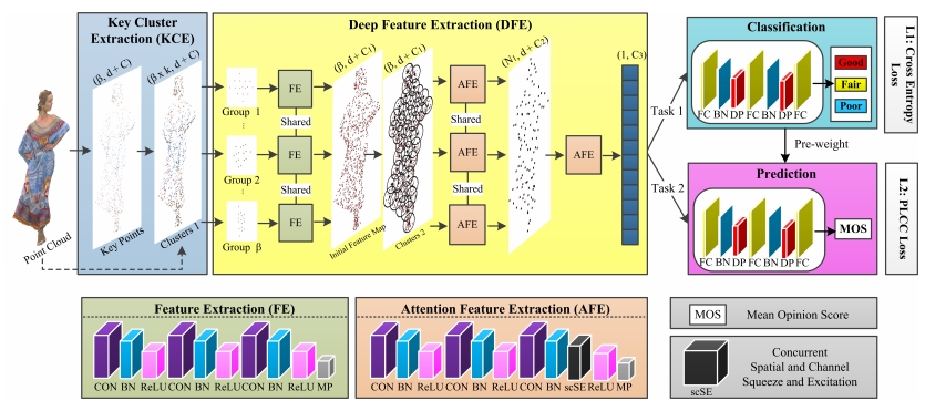 《Progressive Knowledge Transfer Network Based on Human Visual Perception Mechanism for No-Reference Point Cloud Quality Assessment》發(fā)表于IEEE Transactions on Visualization and Computer Graphics,第一作者是蘇洪磊,通訊作者是劉祺和元輝。基于人類視覺感知機制,本課題組課題組提出了一種逐步優(yōu)化質(zhì)量預(yù)測的深度學(xué)習(xí)架構(gòu)。PKT-PCQA首先進行粗粒度的質(zhì)量分類學(xué)習(xí),將點云質(zhì)量分級模擬人眼對優(yōu)劣的初步判斷,隨后通過漸進式知識遷移將該粗粒度認(rèn)知逐步轉(zhuǎn)化為精細的質(zhì)量評分任務(wù)。模型融合了點云的局部與全局特征,并引入空間和通道注意力模塊,提升對視覺失真的敏感度。經(jīng)三個大規(guī)模獨立點云質(zhì)量數(shù)據(jù)庫驗證,PKT-PCQA在無參考和部分參考評價中均優(yōu)于現(xiàn)有方法,對比多種全參考指標(biāo)也表現(xiàn)出相當(dāng)或更優(yōu)的性能。該方法有效提升了模型對點云主觀質(zhì)量的感知一致性,實現(xiàn)了從粗略感知到精確評價的跨越。提出的結(jié)構(gòu)圖如圖4所示。