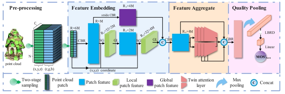 《3DTA: No-Rference 3D Point Cloud Quality Assessment With Twin Attention》發(fā)表于IEEE Transactions on Multimedia,第一作者是2022級研究生朱琳霞,通訊作者是蘇洪磊。此研究提出了一種基于雙重注意力機制的Transformer模型,用于端到端預(yù)測點云感知質(zhì)量。該方法設(shè)計了兩階段采樣策略,有效提取代表整幅點云的幾何和紋理信息,并采用雙注意力模塊(空間注意力和通道注意力)增強模型對失真的感知能力,從而直接輸出點云的主觀質(zhì)量評分。實驗結(jié)果表明,與以往方法相比,3DTA模型在大部分情況下顯著提升了無參考質(zhì)量評價的準(zhǔn)確性,其性能甚至可與部分全參考指標(biāo)相媲美。這一模型結(jié)構(gòu)簡單靈活、適用范圍廣,為無參考PCQA提供了高精度的解決方案。提出的模型結(jié)構(gòu)如圖1所示。