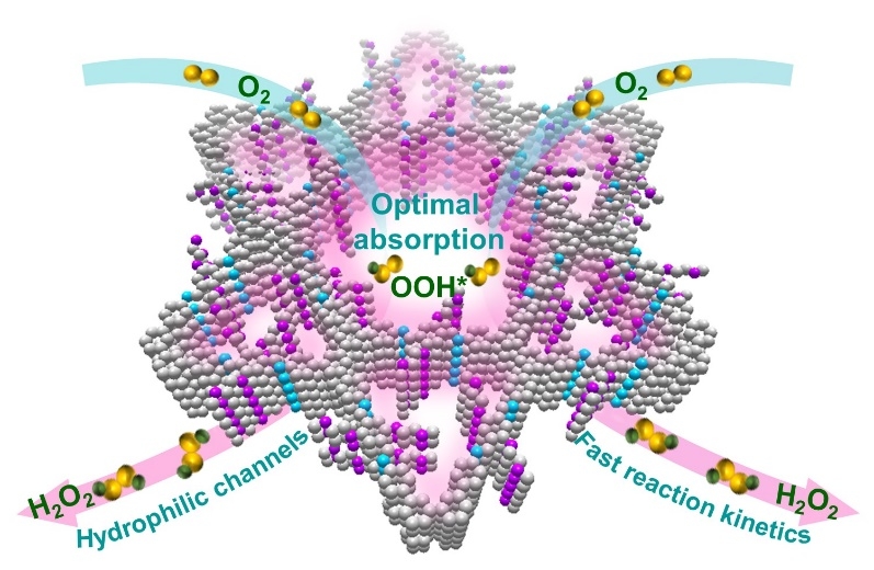 過氧化氫(H2O2)是一種多用途的清潔化學(xué)品,在化學(xué)合成、水處理、造紙和能源儲存等領(lǐng)域具有重要應(yīng)用。傳統(tǒng)生產(chǎn)依賴于蒽醌氧化還原法和貴金屬催化劑,存在成本高、能耗高、環(huán)境污染等問題。電催化氧還原反應(yīng)(ORR)二電子(2e?)途徑合成H2O2因其低能耗、溫和的條件和環(huán)保性而成為一種理想的替代品。其中,非金屬碳基電催化劑,由于較低的成本和電化學(xué)穩(wěn)定性,而被認(rèn)為是商業(yè)貴金屬基電催化劑的有前景的替代品。共價(jià)有機(jī)框架(COF)材料具有可定制的功能構(gòu)建塊、高化學(xué)穩(wěn)定性和孔隙率以及活性位點(diǎn)可調(diào)節(jié)的電子環(huán)境,這賦予了它們ORR電催化活性。因此,有必要構(gòu)建具有高效活性位點(diǎn)、高親水性和自組裝傳輸通道的COF材料實(shí)現(xiàn)高效的H2O2生產(chǎn)。