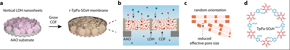 實現高選擇性的鋰離子篩分對于解決鋰資源短缺等難題具有重要意義。然而,由于尺寸及價態等性質相近,從多種高濃度競爭離子(鈉、鉀、鎂、鈣離子)中精準提取鋰離子面臨極大的挑戰。前人發展了多種膜材料用于提鋰,這些材料可以讓鋰離子選擇性透過,但選擇性遠不足以滿足海水提鋰需求。本文研究團隊則反其道而行之,通過構筑隨機取向共價有機框架(COF)基膜材料(圖1),發展了一種可精準截留鋰、傳輸其他陽離子的分離膜用于海水和鹽湖水提鋰,選擇性接近完美。
