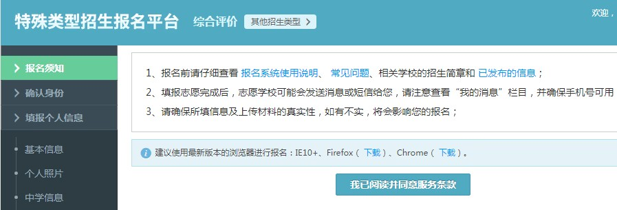 注冊成功后,請使用注冊的用戶名和密碼登錄“綜合評價報名系統”,請仔細閱讀“報名須知”,只填寫基本信息、個人照片、中學信息、成績信息(只填一科成績即可)、選考科目成績信息等系統必填項即可。