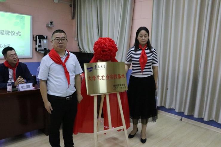 青島大學紡織服裝學院黨委副書記張敏、上馬街道黨工委宣統委員李蓮芳為大學生社會實踐基地揭牌