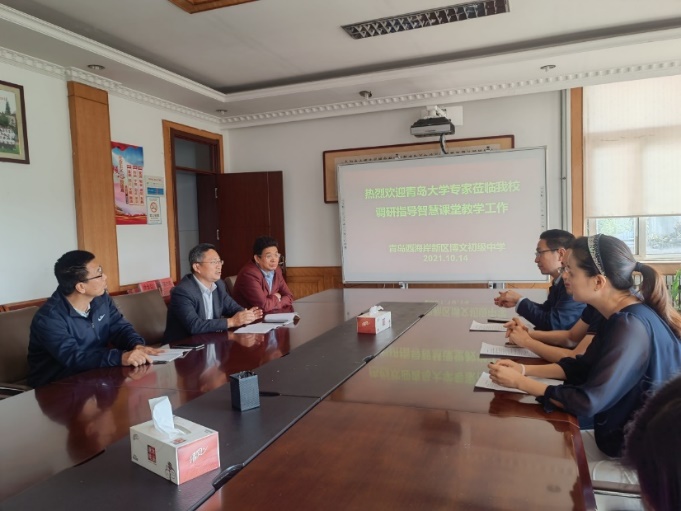 新聞網訊 10月14日,師范學院教育技術系師生赴西海岸新區博文初級中學進行智慧課堂教學應用調研。博文初級中學校長徐全啟、黨支部書記胡學發、副校長葛志勝、教導主任崔桂波、教師代表,教育技術系主任楊進中、王興華教授、田雪葳博士、教育技術系部分研究生參加了調研活動。