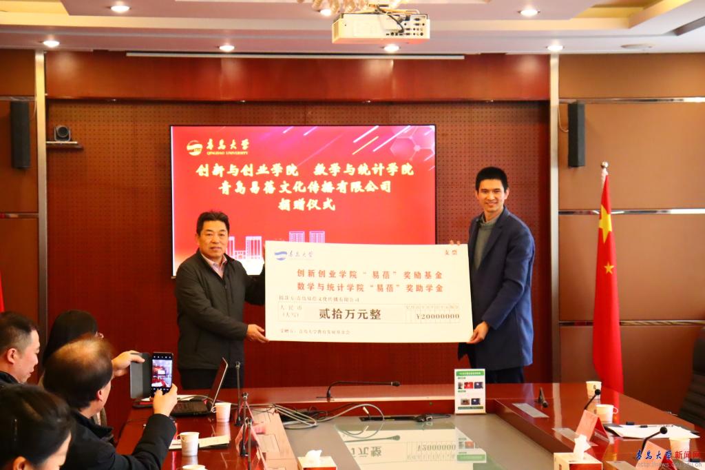 此次青島易蓓文化傳播有限公司無償向青島大學捐贈人民幣20萬元,其中10萬元設立“數學與統計學院‘易蓓’獎助學金”,10萬元設立“創新創業學院‘易蓓’獎勵基金”。