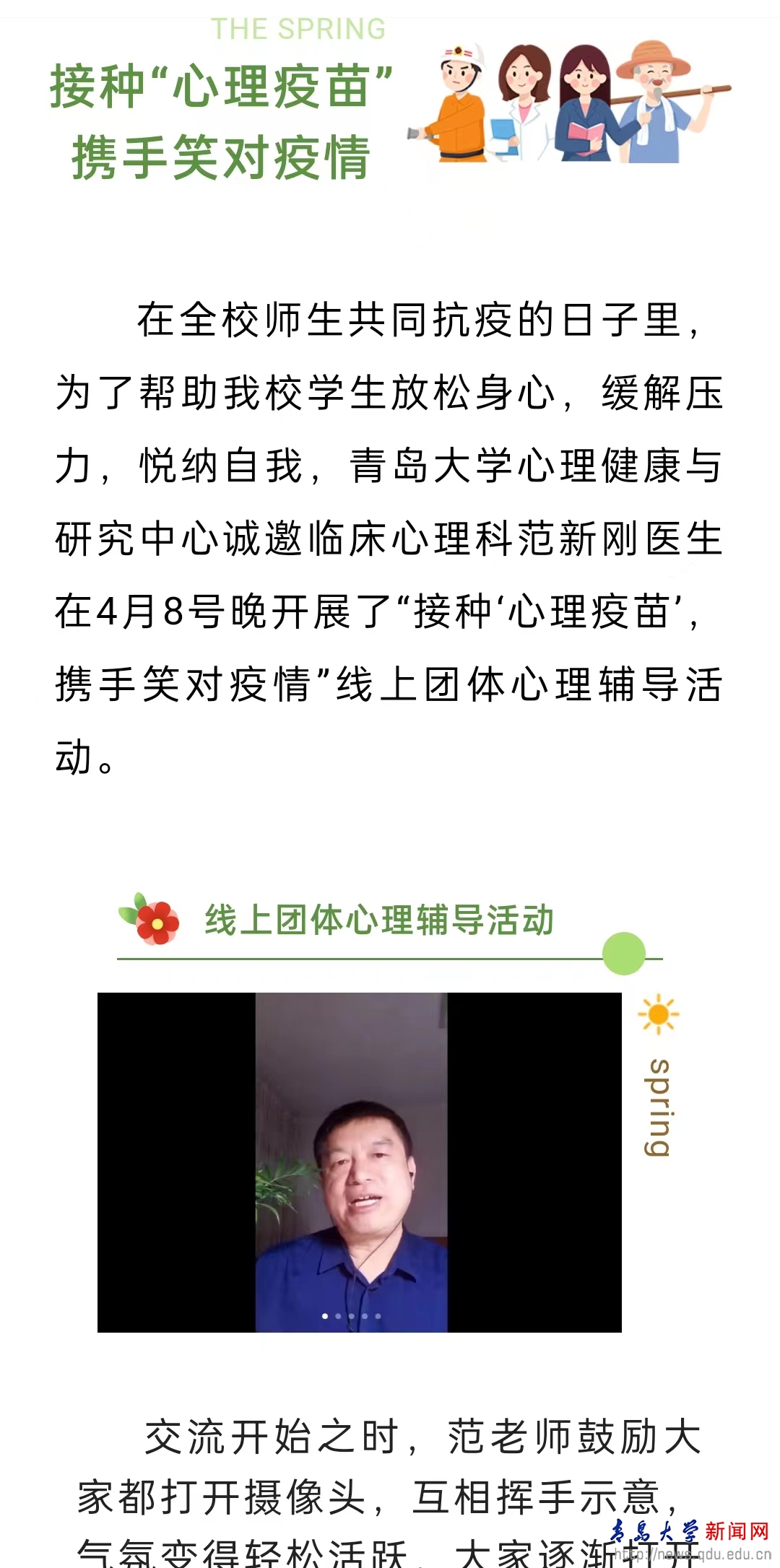 新聞網訊 近日,學生處大學生心理健康教育與研究中心采用線上互動形式為學生開展了“‘疫’路同行、春暖花開”系列團體輔導活動。合作發展處(校友工作辦公室)積極發揮校友助力工程作用,結對學生處,發動青島大學校友心理聯盟助力母校人才培養和學生工作,四位校友為同學們開展輔導,近300名學生積極報名參加。