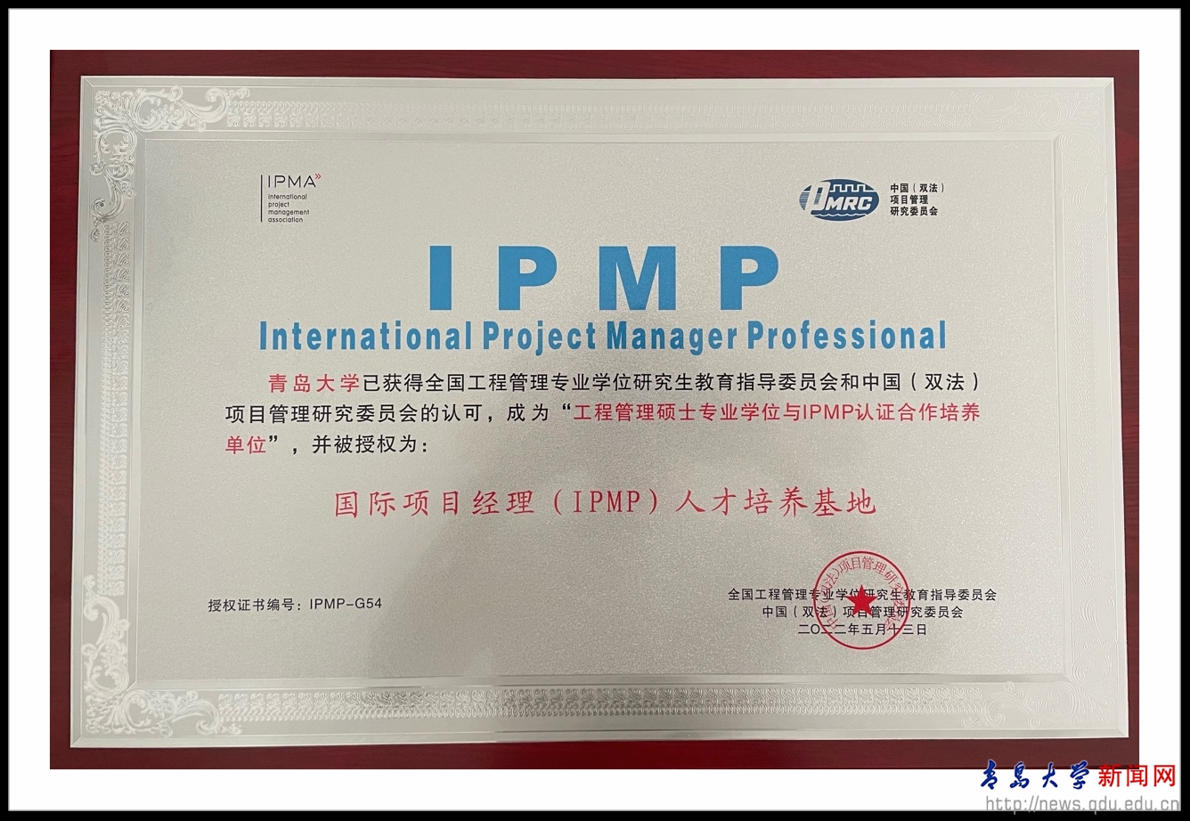 新聞網(wǎng)訊 近日,青島大學(xué)獲得全國工程管理專業(yè)學(xué)位研究生教育指導(dǎo)委員會(huì)和中國(雙法)項(xiàng)目管理研究委員會(huì)的認(rèn)可,成為“工程管理碩士專業(yè)學(xué)位與IPMP認(rèn)證合作培養(yǎng)單位”,并被授權(quán)為國際項(xiàng)目經(jīng)理(IPMP)人才培養(yǎng)基地,授權(quán)證書編號(hào)為IPMP-G54。