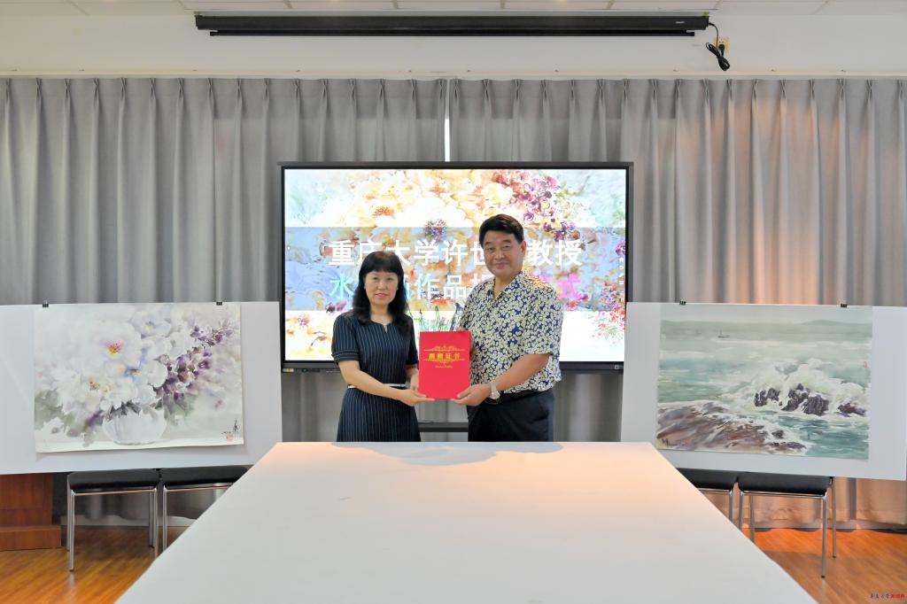新聞網訊 7月4日下午,應機電工程學院邀請,中國當代藝術名家重慶大學藝術學院許世虎教授在浮山校區(qū)誠思樓211會議室向師生們進行水彩畫示范,通過現(xiàn)場創(chuàng)作讓師生們充分感受水彩之美。許世虎教授將現(xiàn)場創(chuàng)作的兩幅水彩畫作品《濤聲》和《盛開》作為慶祝青島大學合并辦學30周年的禮物捐贈給學校收藏。校黨委常委、副校長劉彩云出席捐贈儀式并代表學校為許世虎教授頒發(fā)了捐贈證書。