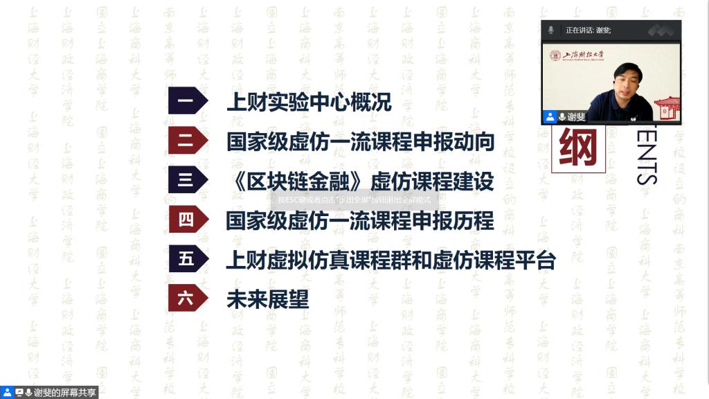 謝斐副主任從全校實驗體系搭建者和國家級“金課”建設者兩個角度,先后介紹了國家級虛擬仿真一流課程申報動向、《區塊鏈金融》虛仿課程建設經驗、國家級虛仿一流課程申報歷程、上財虛擬仿真課程群和虛仿課程平臺建設現狀等多方面的內容。謝斐副主任的報告精彩紛呈,既有頂層設計的邏輯思考,又有課程建設的實踐細節,既有對經驗的系統總結,又有對未來的科學規劃,引發了參會者的強烈共鳴和熱烈討論,使大家受益匪淺。