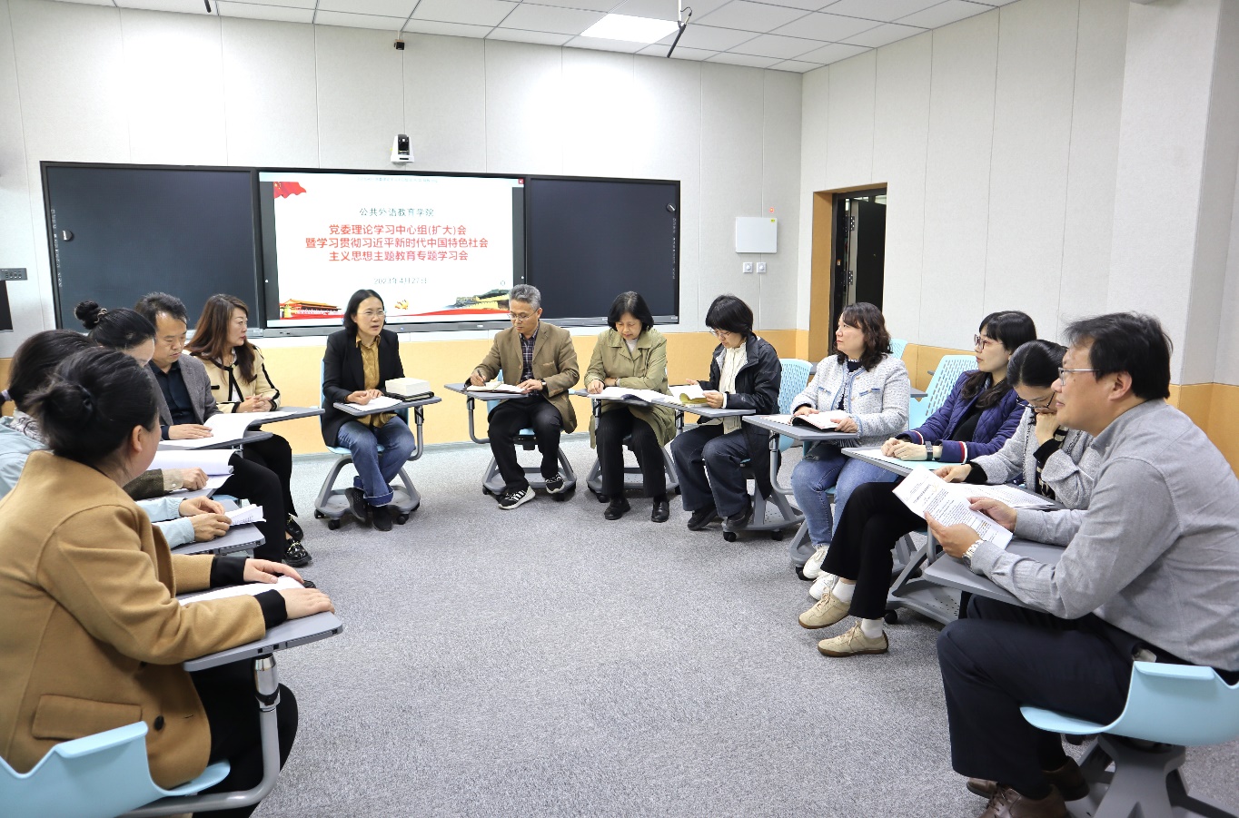新聞網訊 4月27日下午,公共外語教育學院黨委理論學習中心組(擴大)在睿思樓202會議室舉行習近平新時代中國特色社會主義思想主題教育主題學習會。會議由院黨委書記劉海榮主持,學院黨政領導、骨干教師參加學習。