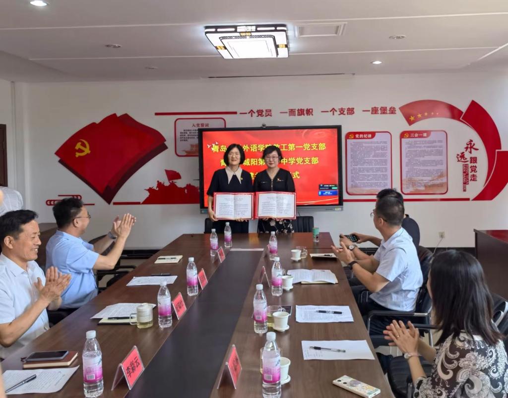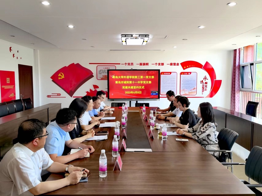 新聞網訊 為創新基層黨建工作載體,提高基層黨建工作水平,推動學習貫徹習近平新時代中國特色社會主義思想主題教育走深走實,6月8日上午,外語學院教工第一黨支部和青島市城陽區第十一中學黨支部舉行支部共建簽約儀式。學院黨委書記周偉,紅島教育服務中心黨總支書記紀瑞仕,城陽區第十一中學校長呂廷良等雙方相關領導出席活動。