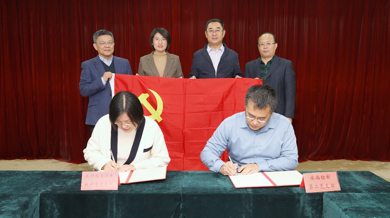 青島市疾病預防控制中心第二黨支部書記楊峰,我校公共衛生學院副院長、流行病與衛生統計學黨支部書記沈曉麗分別介紹了本支部情況,并一起簽署了黨支部結對共建協議書。