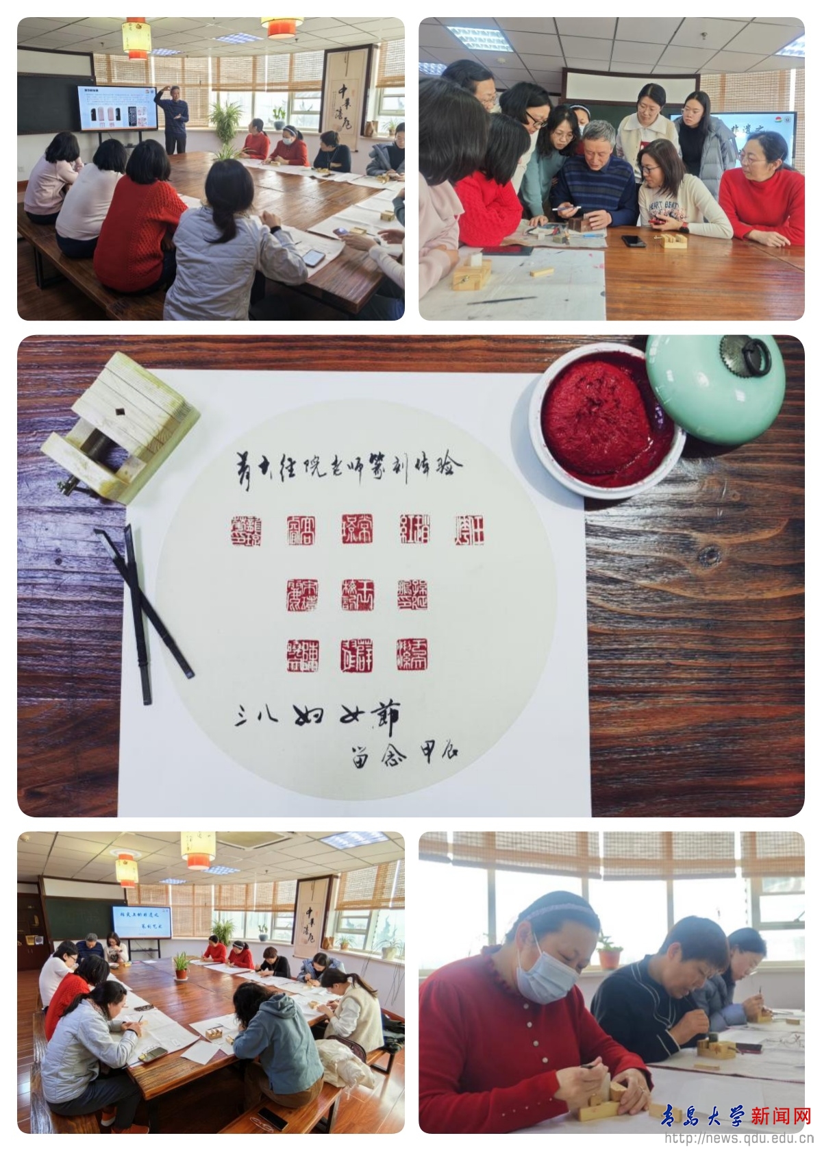 新聞網訊 為慶祝“三八”婦女節,傳承中國優秀傳統文化,感受古代書法藝術的獨特韻味,增強教職工對民族文化的自豪感和認同感,3月7日下午,經濟學院工會、婦委會舉辦“鐫刻匠心,氣韻華章”篆刻沙龍活動,經濟學院黨委副書記于文潔帶領教職工代表赴青島市婦女兒童活動中心少兒國學院參加活動。