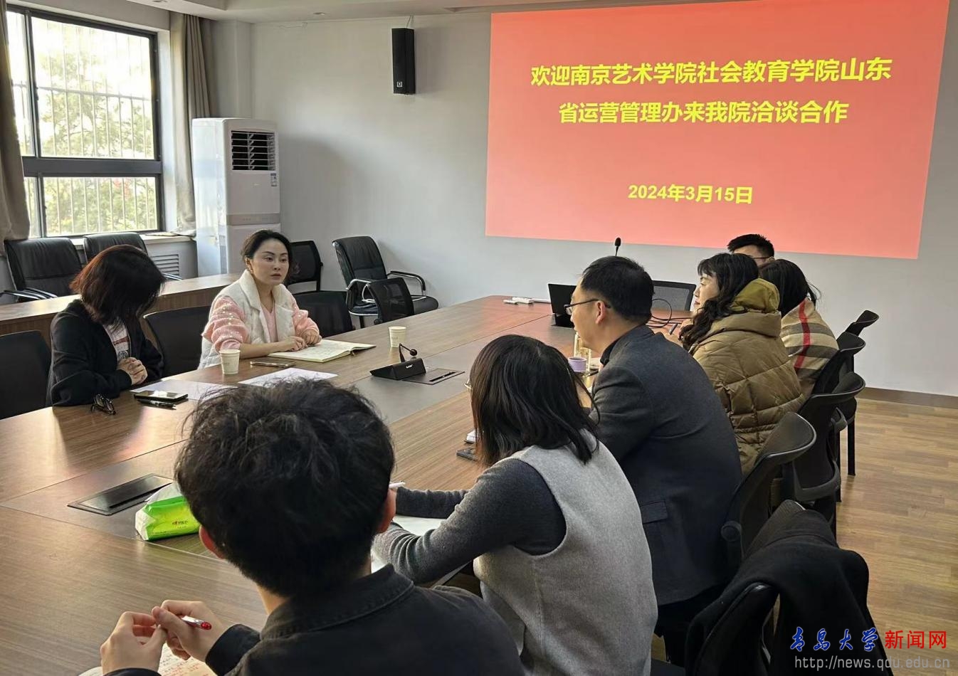 新聞網訊 3月15日,南京藝術學院社會教育學院山東省運營管理辦主任王晨瑜一行三人來訪音樂學院洽談合作,院黨委副書記孫建華、副院長董博超、學工辦主任遲曉波、學生黨支部書記樸博文等參加座談交流。