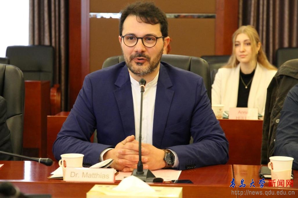 與會(huì)人員觀看了青島大學(xué)英語(yǔ)宣傳片,綦甲福向研學(xué)團(tuán)介紹了魯巴教育合作項(xiàng)目——青島大學(xué)德語(yǔ)專業(yè)發(fā)展情況及取得的成績(jī),并重點(diǎn)介紹了我校牽頭承擔(dān)的山東省社科重大委托項(xiàng)目“李希霍芬五卷本《中國(guó)》翻譯與研究”的進(jìn)展情況,期待與拜大地理學(xué)院師生建立合作,扎實(shí)推進(jìn)項(xiàng)目研究工作。