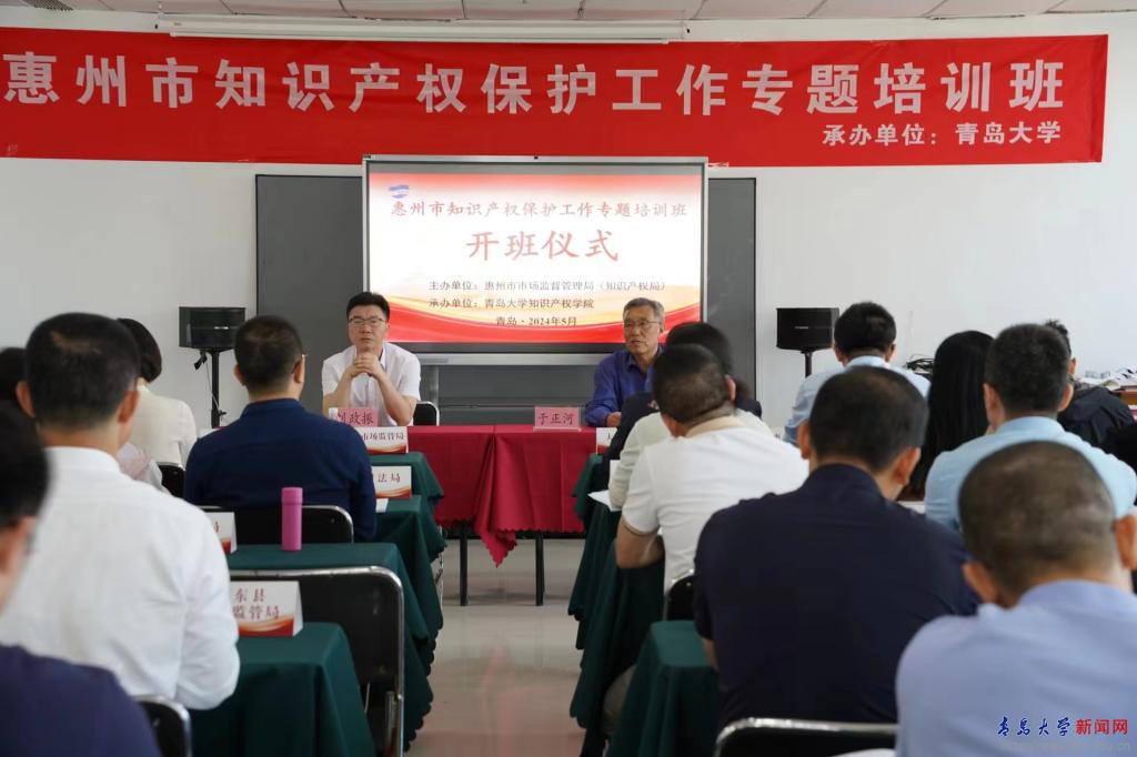 惠州市市場監管局黨組成員、副局長劉政振,青島大學知識產權學(研究)院院長于正河教授共同出席開班儀式并致辭。此次培訓在課程設置、師資配備和教學方法等方面進行了認真謀劃、精心安排,結合工作實際及培訓目的,采取“專題授課+小組討論+現場教學”相結合的方式,培訓內容涉及知識產權行政保護實務、專利轉化實施案例、知識產權與創新發展,以及商標、地理標志和標準化戰略助力知識產權強市建設等專題。培訓班全體學員還集體前往海信研發基地進行了現場參觀學習。