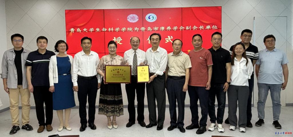 儀式上,王中為青島大學生命科學學院授予“青島市康養學會副會長單位”,薛冰受聘為青島市康養學會特聘副會長。