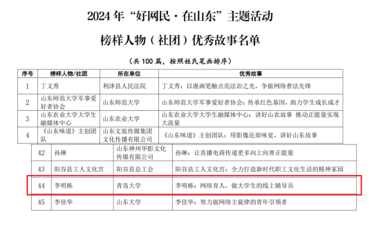 新聞網(wǎng)訊 7月15日,2024年“好網(wǎng)民·在山東”優(yōu)秀故事評選結果公布,材料科學與工程學院輔導員李明棟入選榜樣人物優(yōu)秀故事名單。