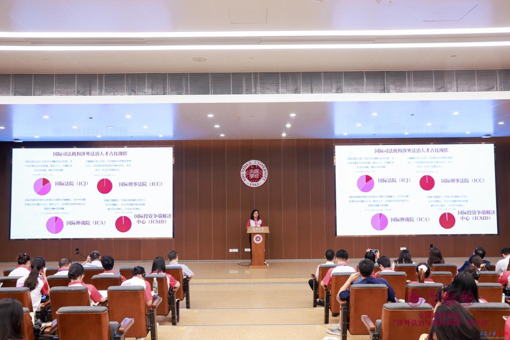 在閉營儀式上,營員們化身研究學者,圍繞8個涉外法治學術議題上臺匯報。他們結合6天行程的所見、所聞、所思、所想,從人才培養、規則銜接、實務操作、市場需求,交流彼此的認知和視野。梁玉潔同學作為代表上臺就涉外法治人才培養途徑發表主題發言,取得了在場專家和老師同學的一致認可與好評,展現了青島大學法學院的風采。