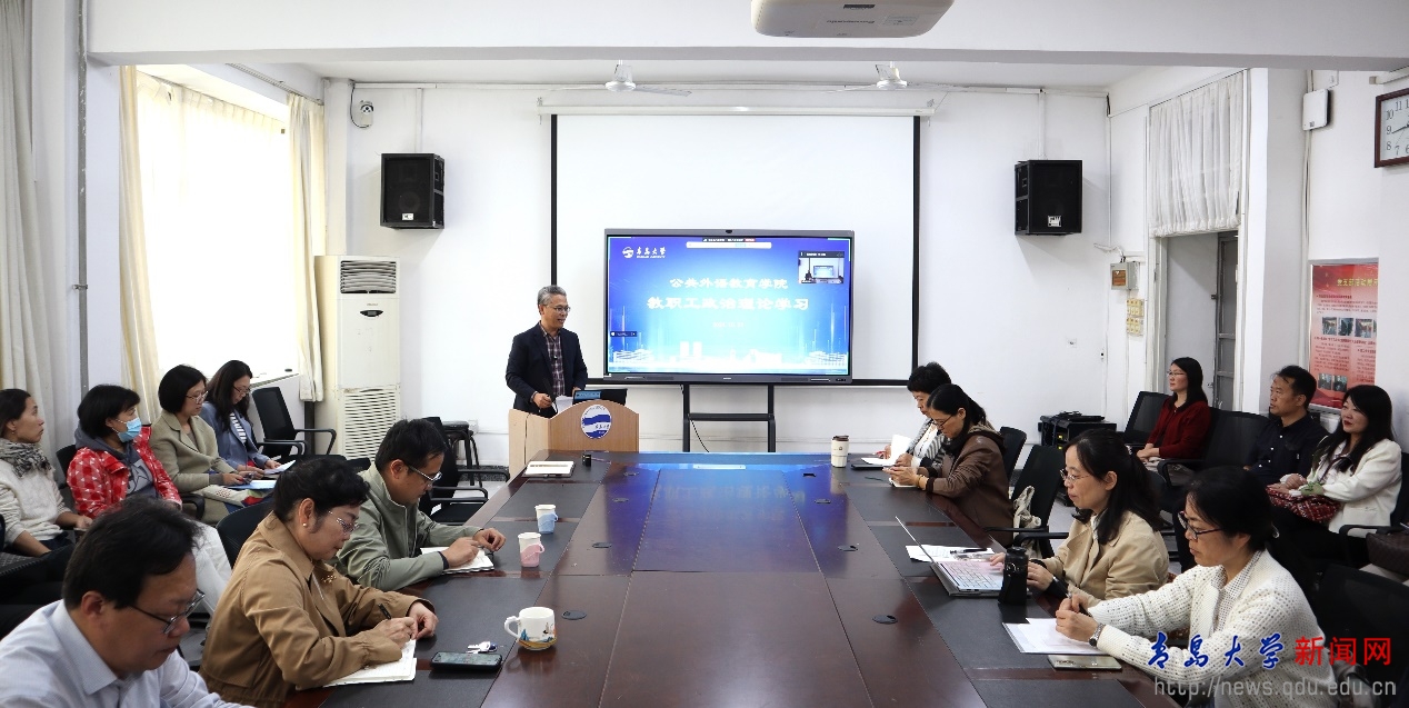 新聞網(wǎng)訊 10月24日,公共外語教育學(xué)院在睿思樓202會(huì)議室召開全體教職工政治理論學(xué)習(xí)會(huì)暨大學(xué)英語活動(dòng)月教師研修分享會(huì)。校黨委第二巡察組副組長(zhǎng)孫鵬、成員沈香韞蒞臨督導(dǎo),學(xué)院班子成員及全體教師參會(huì)。學(xué)院黨委副書記、院長(zhǎng)國(guó)林祥主持會(huì)議。
