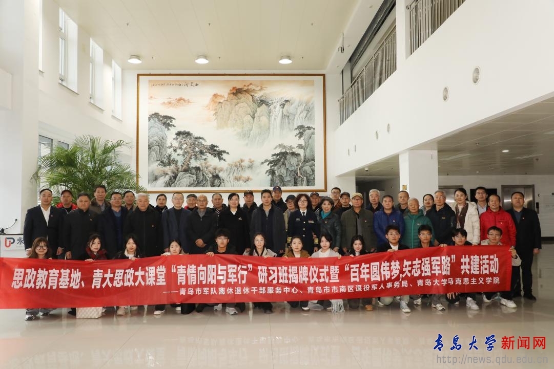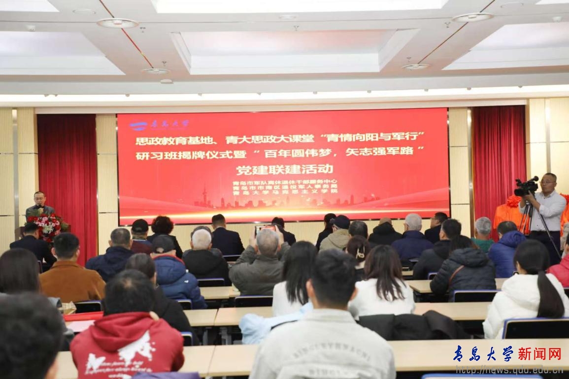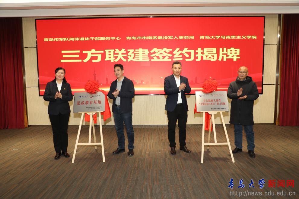 新聞網(wǎng)訊 12月12日下午,馬克思主義學(xué)院、青島市軍隊(duì)離休退休干部服務(wù)中心、青島市市南區(qū)退役軍人事務(wù)局在青島大學(xué)會(huì)議中心舉行“思政教育基地”和“青大思政大課堂‘青情向陽(yáng)與軍行’研習(xí)基地”揭牌儀式,并開(kāi)展“百年圓偉夢(mèng),矢志強(qiáng)軍路”黨建共建活動(dòng)。青島市軍隊(duì)離休退休干部服務(wù)中心黨委副書(shū)記、副主任秦詠梅,市南區(qū)退役軍人事務(wù)局黨組書(shū)記、局長(zhǎng)宋吉?jiǎng)伲倚qR克思主義學(xué)院黨委書(shū)記王傳永出席活動(dòng)。活動(dòng)由馬克思主義學(xué)院副院長(zhǎng)張義生主持。