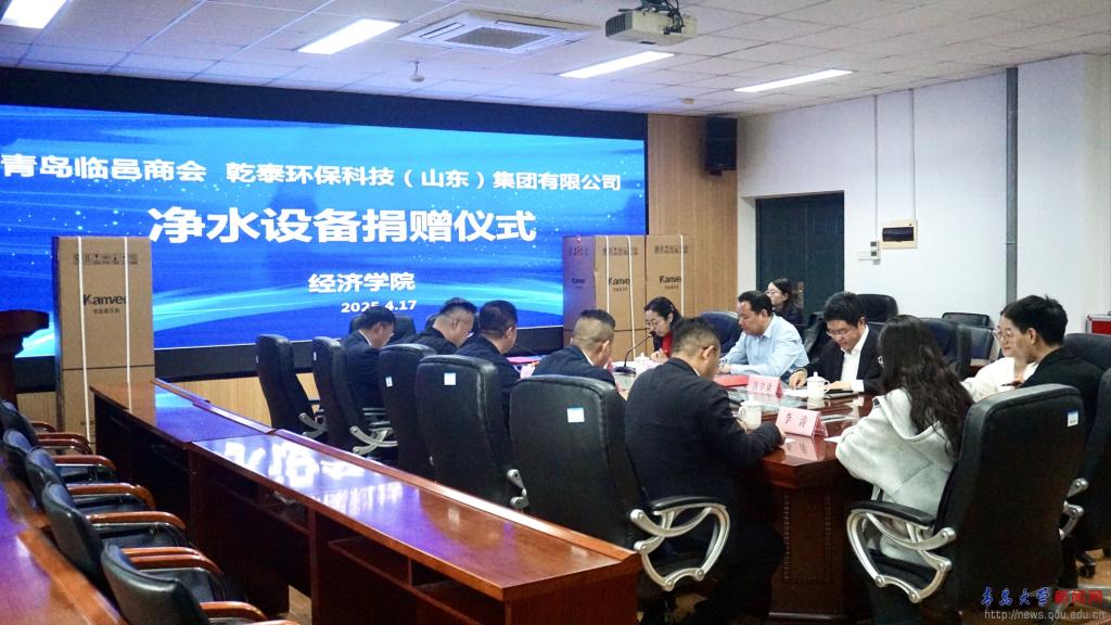 新聞網訊 4月17日下午,青島臨邑商會、乾泰環保科技(山東)集團有限公司凈水設備捐贈儀式在守實樓307會議室舉行。青島臨邑商會會長鄭京衛,乾泰集團董事長、商會副會長肖安平,乾泰集團總經理房振海,商會執行秘書長滕平瑞,青島奧碩興體育設施工程有限公司總經理、商會會員單位李濤,經濟學院黨委書記邱建國、院長呂學梁出席捐贈儀式。儀式由經濟學院黨委副書記于文潔主持。