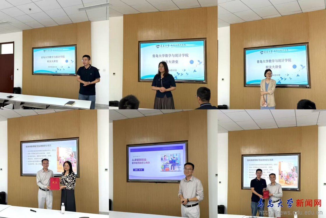創新創業學院與數學統計學院分別向曲藝校友頒發了“青島大學創新創業導師”以及“數學與統計學院校友導師”聘書,希望他繼續發揮校友力量,持續關心支持學校創新創業教育和學院發展。