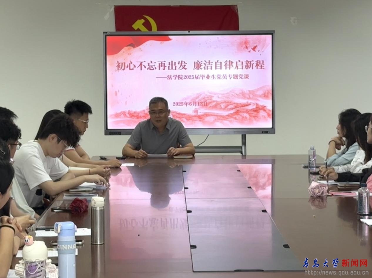 新聞網訊 為進一步落實畢業生黨員教育管理,勉勵全體畢業生黨員以良好的精神風貌踏入新的征程,6月13日上午,法學院黨委開展了以“初心不忘再出發,廉潔自律啟新程”為主題的畢業生黨員專題黨課。法學院黨委書記李建新主講黨課,黨委副書記龐在辛,學生黨支部書記白嘉寧、魏澤楷及全體畢業生黨員參加黨課。