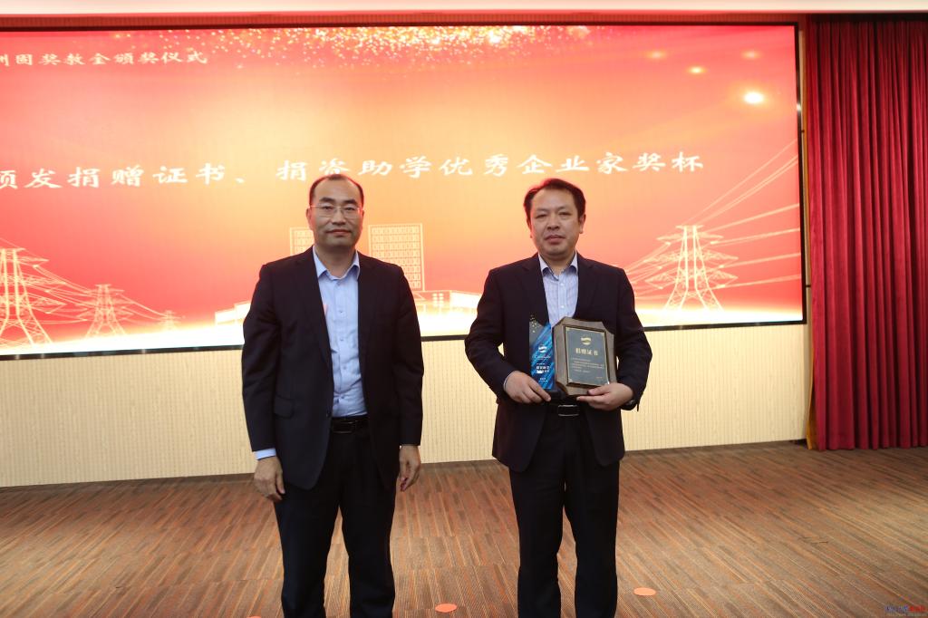 孔偉金代表學校給上海洲固電力科技有限公司頒發捐贈證書,向李勇頒授“捐資助學優秀企業家”獎牌。