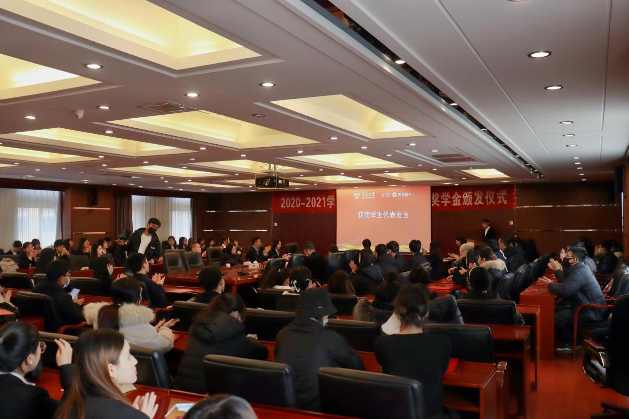 劉彩云代表我校對支持學校事業發展的青島銀行表達了衷心的感謝,期待雙方能夠通過校銀聯合,重點在人才培養、科學研究、社會服務等領域深化交流與合作,推動雙方事業發展,共同為山東半島藍色經濟區建設以及國家經濟社會發展貢獻力量。她同時對獲獎學生表示祝賀,希望受到獎勵的同學們能夠牢記總書記對青年人提出的希望和要求,在“國之大者”中找準支點,錨定坐標,以“功成不必在我,功成必定有我”的情懷求真問學、拼搏奮進,創造無愧于時代、無愧于青春的新成績!