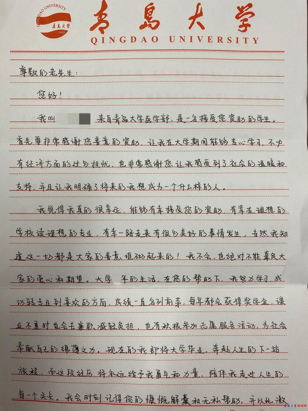 90歲高齡的趙老先生依然身體健朗。他曾是一名軍隊醫務人員,平時生活很節儉,始終保持著在部隊上勤儉節約的作風、醫務工作者的情懷。退休之后,趙老先生一直有意資助一名家庭經濟困難且努力上進的醫學生。2017年冬天,趙老先生走進了青島大學,了解到該受助學生的情況,從此便開始了他默默無聞的資助之路。這一捐就是五年,迄今捐贈資金累計兩萬余元。五年來,趙老先生無論身居何處,無畏高齡和身體,堅持親自到學校捐贈資金。2021年,考慮到受助學生面臨畢業等因素,趙老先生主動提出并增加了部分捐贈額度。雖然此前趙老先生的家人并不知情,但近日他們了解情況后表示,趙老先生一直樂善好施,令人尊重,對于趙老先生多年的捐贈舉動,他們并不感到驚訝,也給予充分的理解和支持。