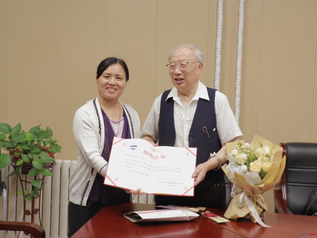 孔燕代表學校向趙老先生長期關心和支持學校的事業發展、多年資助我校學生成長表示衷心的感謝,代表學校基金會為其頒發了捐贈證書。隨后,受助學生向趙老先生誦讀感謝信并獻上鮮花和荷包以示感激之恩。