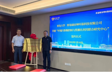 于永明副校長與李紹坤董事長為“聯(lián)合研究中心”揭牌。我校環(huán)境科學(xué)與工程學(xué)院陳光輝副教授與青島綠潔坤環(huán)保科技有限公司李佳麟總經(jīng)理簽訂《青島大學(xué)-青島綠潔坤環(huán)保科技有限公司共建“環(huán)境污染物控制與資源化利用聯(lián)合研究中心”合作協(xié)議》。