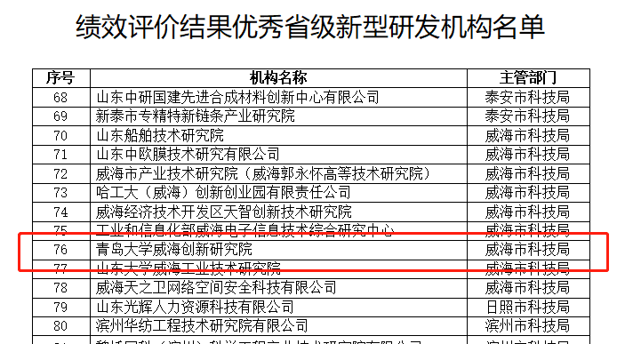 新聞網訊 近日,山東省科技廳公示2022年度省級新型研發機構績效評價結果,我校威海創新研究院再次榮獲省級新型研發機構績效評價“優秀”等次。本次考評,全省共有89家省級新型研發機構績效評價結果優秀,其中,威海全市占9家。