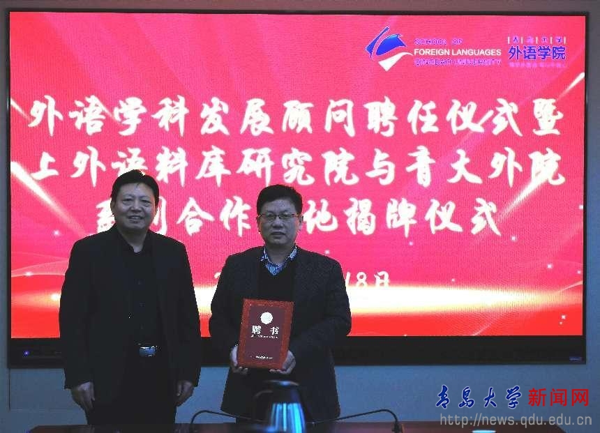 接下來舉行了隆重的聘任儀式,陳濤為胡開寶頒發了青島大學外語學科發展咨詢專家委員會顧問聘書。