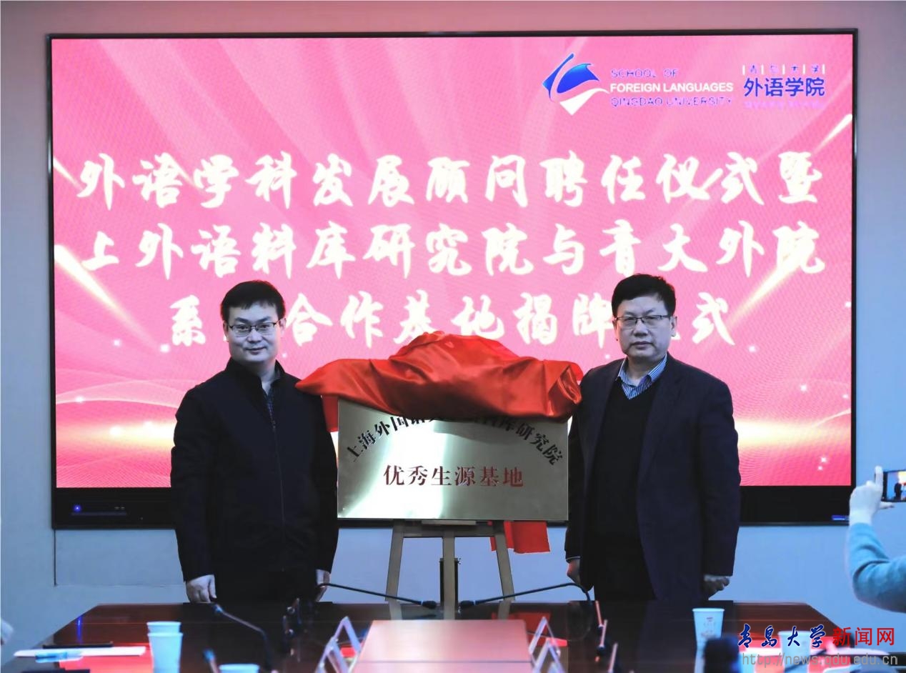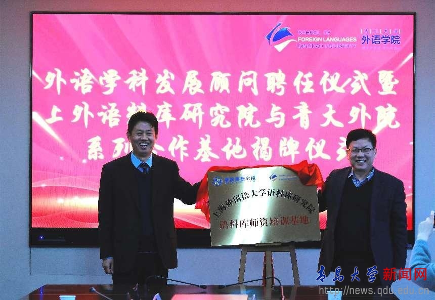 隨后,胡開寶與校相關部門負責人分別為上外語料庫研究院和青大外院系列合作基地揭牌。