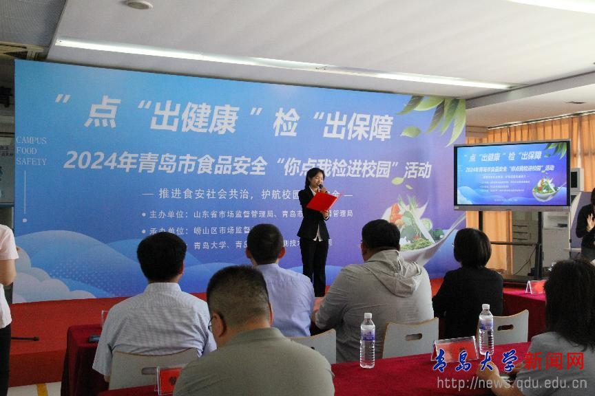 啟動儀式上觀看了青島市“你點我檢”工作宣傳視頻、發布十大重點點檢品種、區域、并與同學用一問一答方式現場互動宣傳食品安全相關知識。